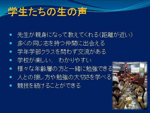 本科に入学して良かったことについては、以下のスライド「学生たちの生の声」で提示します。