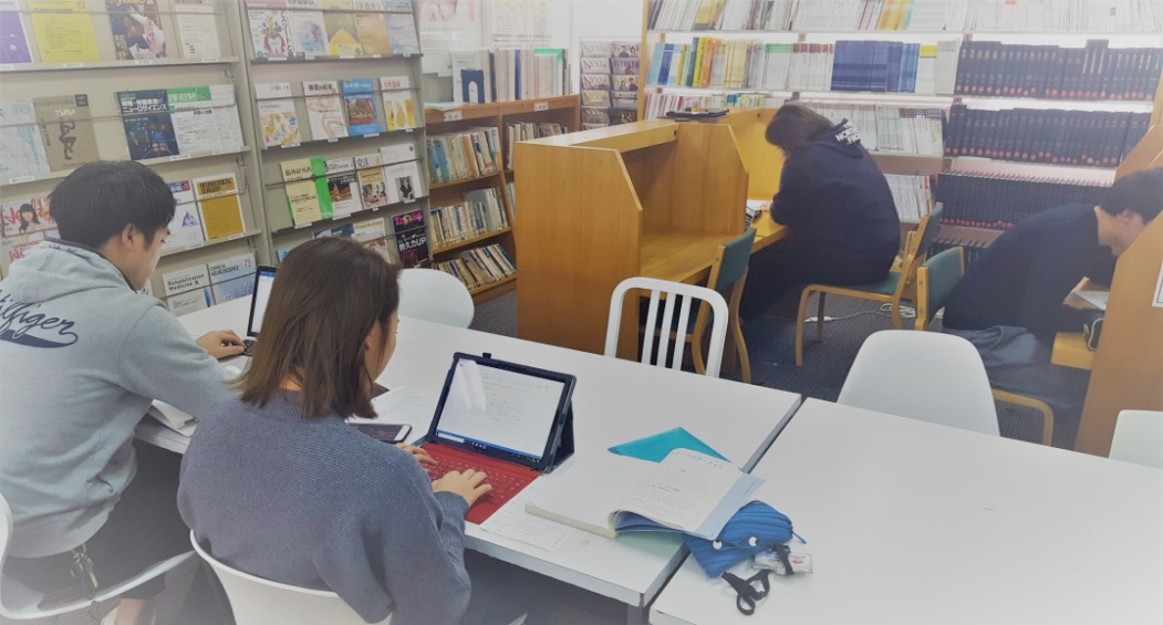 図書館では、3年生がスポーツ理学療法について勉強していました。