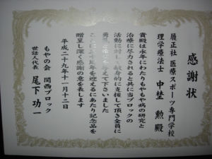 徳永英明さんで一躍その病名がマスコミで報道されましたね。もやもや病は元来、乳児期に発症する脳血管障害で、原因不明の進行性難病です。これまで約35年間、私はこの病気のリハビリテーションに携わってきました。まだまだ複雑な病気なのですが、私たち理学療法士は原因が何であれ、障害があれば対応する仕事です。高齢者と乳幼児とは社会的背景は異なりますが、子供たちや両親から多くの事を学びました。これからも頑張ります。
