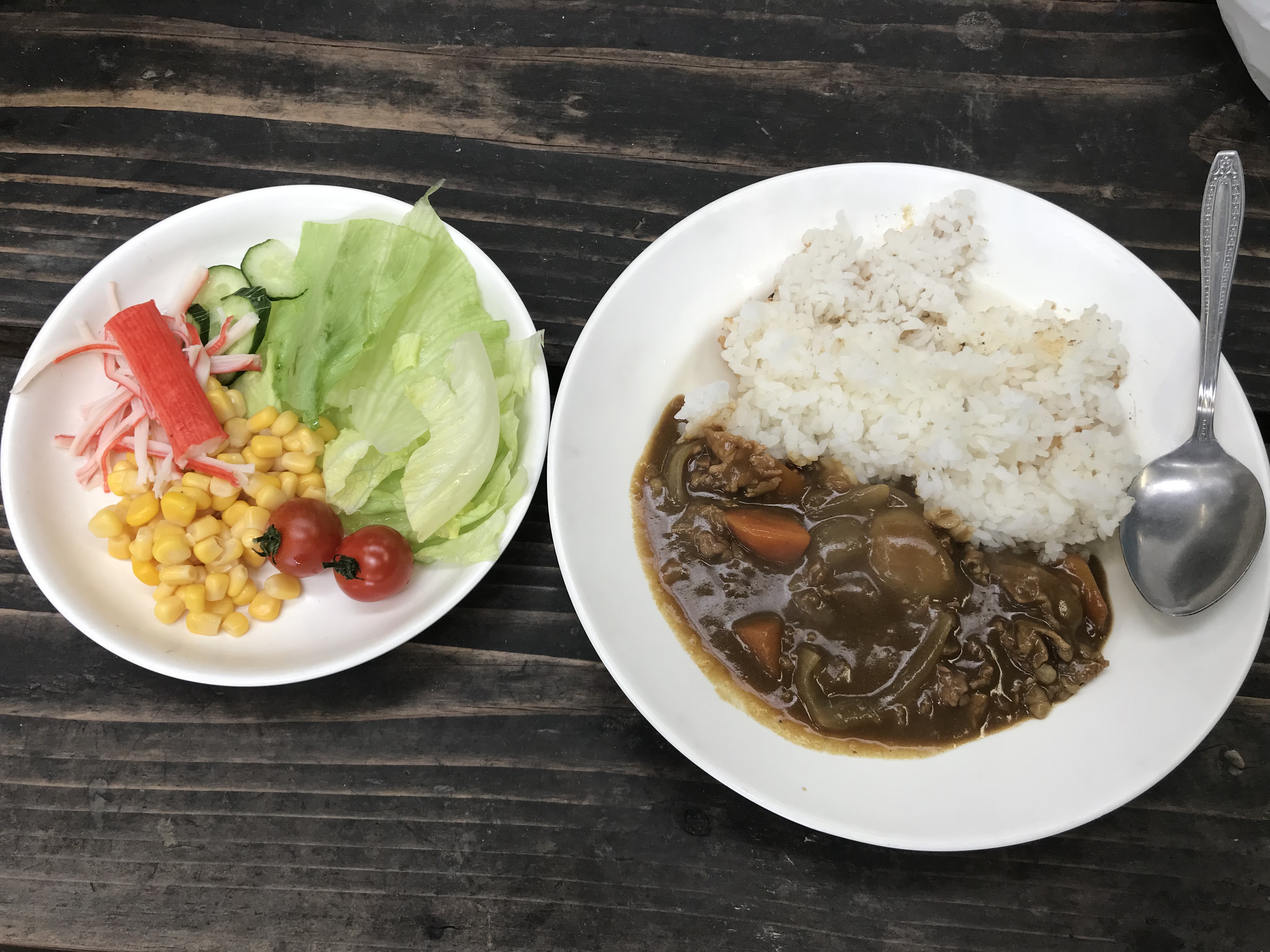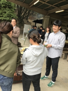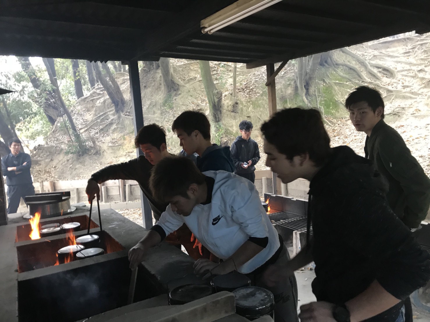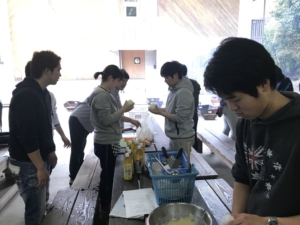 オリエンテーション合宿の最後は飯盒炊爨でカレーとバームクーヘン作りです。