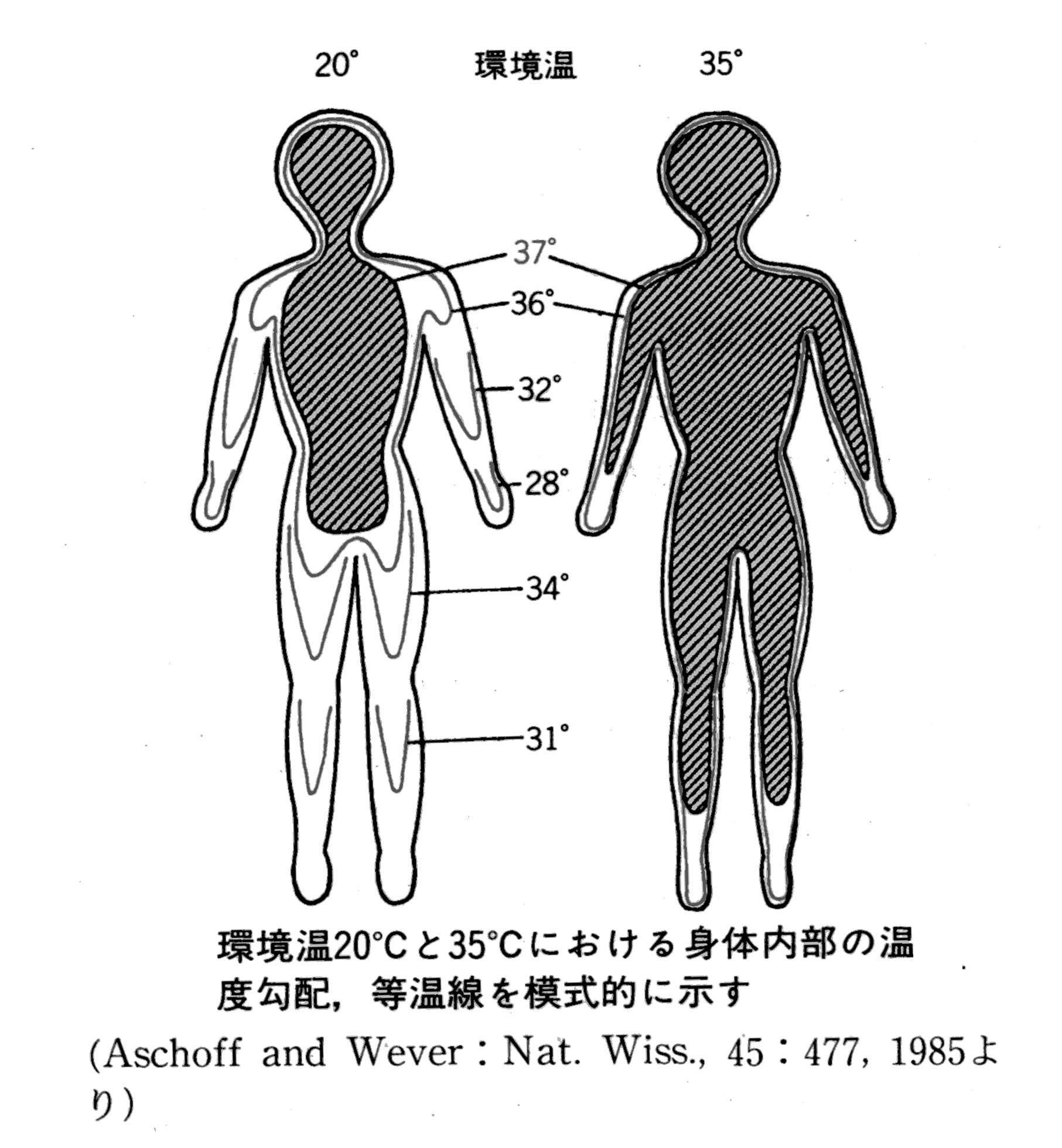 人の体温は、外殻温(皮膚の温度)と核心温(内蔵を含む身体内部の温度:深部体温)に分類されます。左図では斜線部(37度超過)の深部体温が、外気温(環境温)が高くなるにつれて広範囲になることを示しています。
