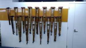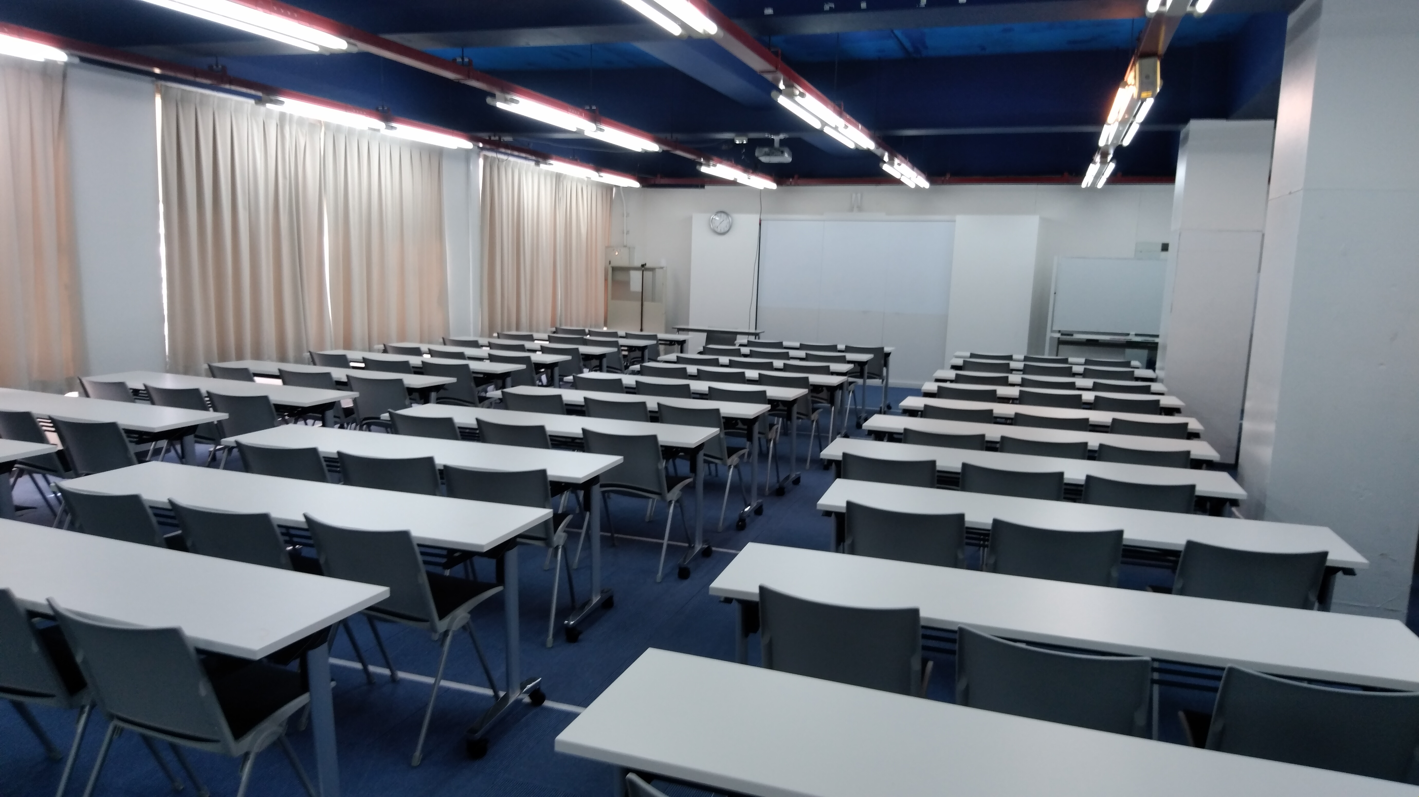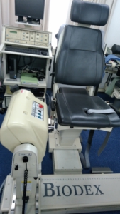多い時には100人近い学生が一緒に学ぶ訓練室には、机やホワイトボードだけでなく、リハビリで使う松葉杖や車椅子、スポーツ分野で良く用いるBIODEX(筋力の強さを測定します)やエアロバイク等たくさんの機器が揃っています。