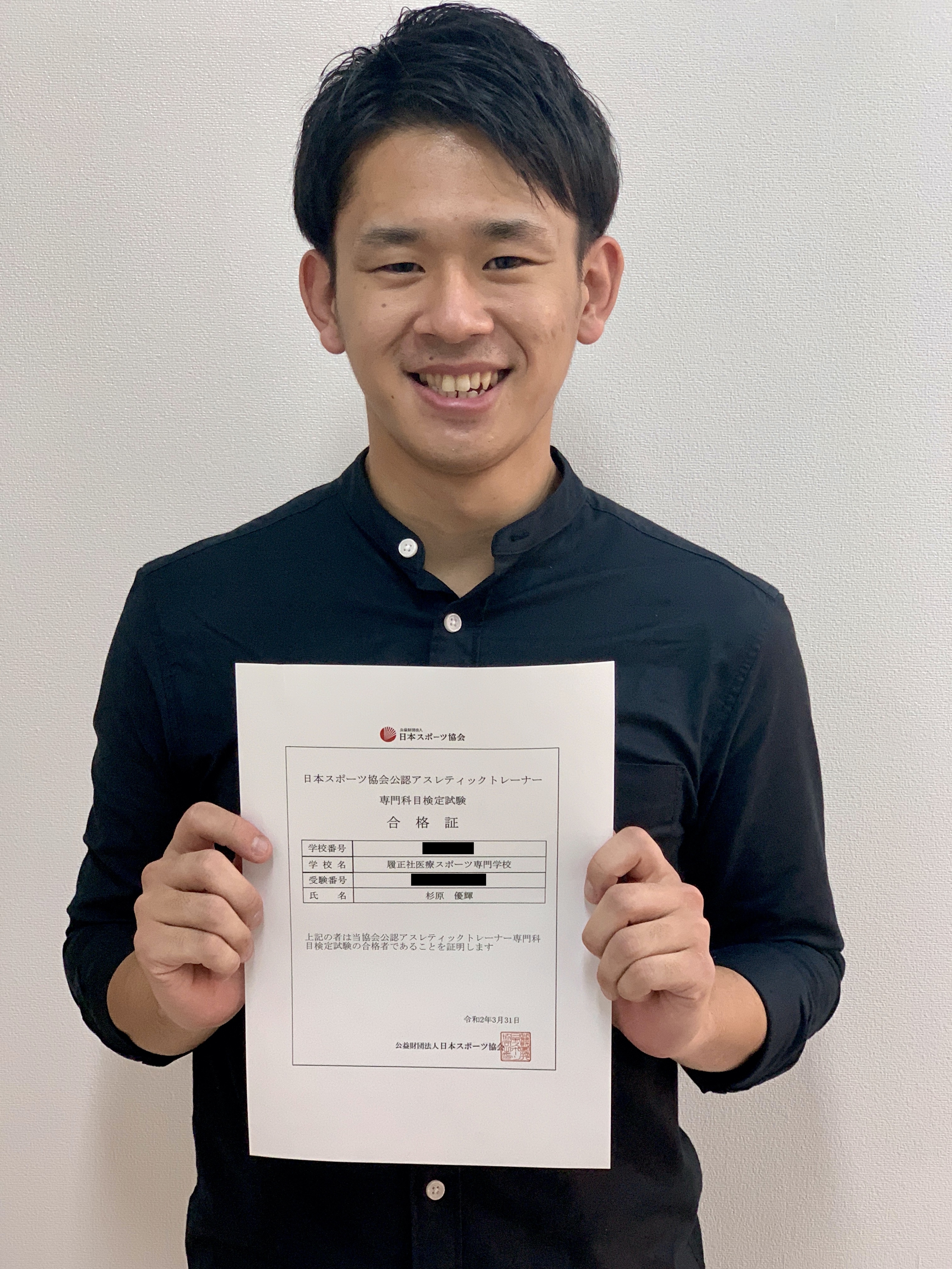 杉原さんはサッカーのメディカルアスリート専攻の5年コース(現在は廃止)でサッカーコース、理学療法学科、アスレティックトレーナーと3つのコースで学び卒業されました。そして、理学療法士国家資格と今回アスレティックトレーナーの資格を両方取得されました。私の知る限り本校のメディカルアスリート専攻でかつ理学療法を専攻していた学生では初の快挙となっています。
