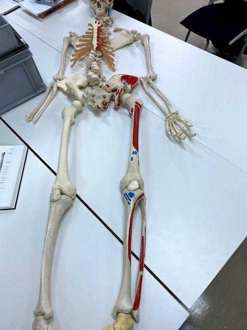 この写真は解剖を勉強しながら学生達がグループに分かれ組み立てた骨模型です。見ての通り人の身体には様々な形の骨があり、総数は約200個と言われています。それら全ての骨名や部位名を覚えることは基本中の基本となり、その骨の周りに着く筋肉や靭帯、関節の構造、神経等々膨大な量を覚える必要があります。今、それらを一つずつ覚えている1年生、見本の骨模型や教科書を見ながら組み立て、自分の身体やクラスメイトの身体を触りながら覚えている様子が見受けられます。私が学生の頃、一人ではなかなか勉強が進まず苦労していたことを思い出しました。一人での勉強よりクラスメイトに教えてもらったり、雑談で医療用語を使ってみたり、問題を出し合ったりしたことの方が覚えやすいこともあったのかなぁと思います。