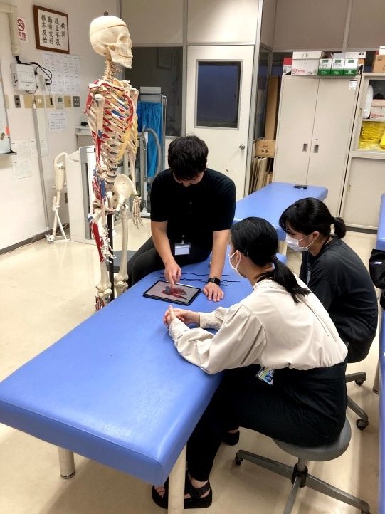 教員:「教科書で読んでいると分からなくなってしまうことも多いよね。その時に、今みたいに、難しい言葉は使用せずに、実際に骨模型を利用したり、ジェスチャーを利用してみるのも良いかもしれませんね。どうしても骨の名称など覚えることはあるけれど、骨の名称から覚えないといけないということはないのでイメージをつけるところから実施してもいいね。」