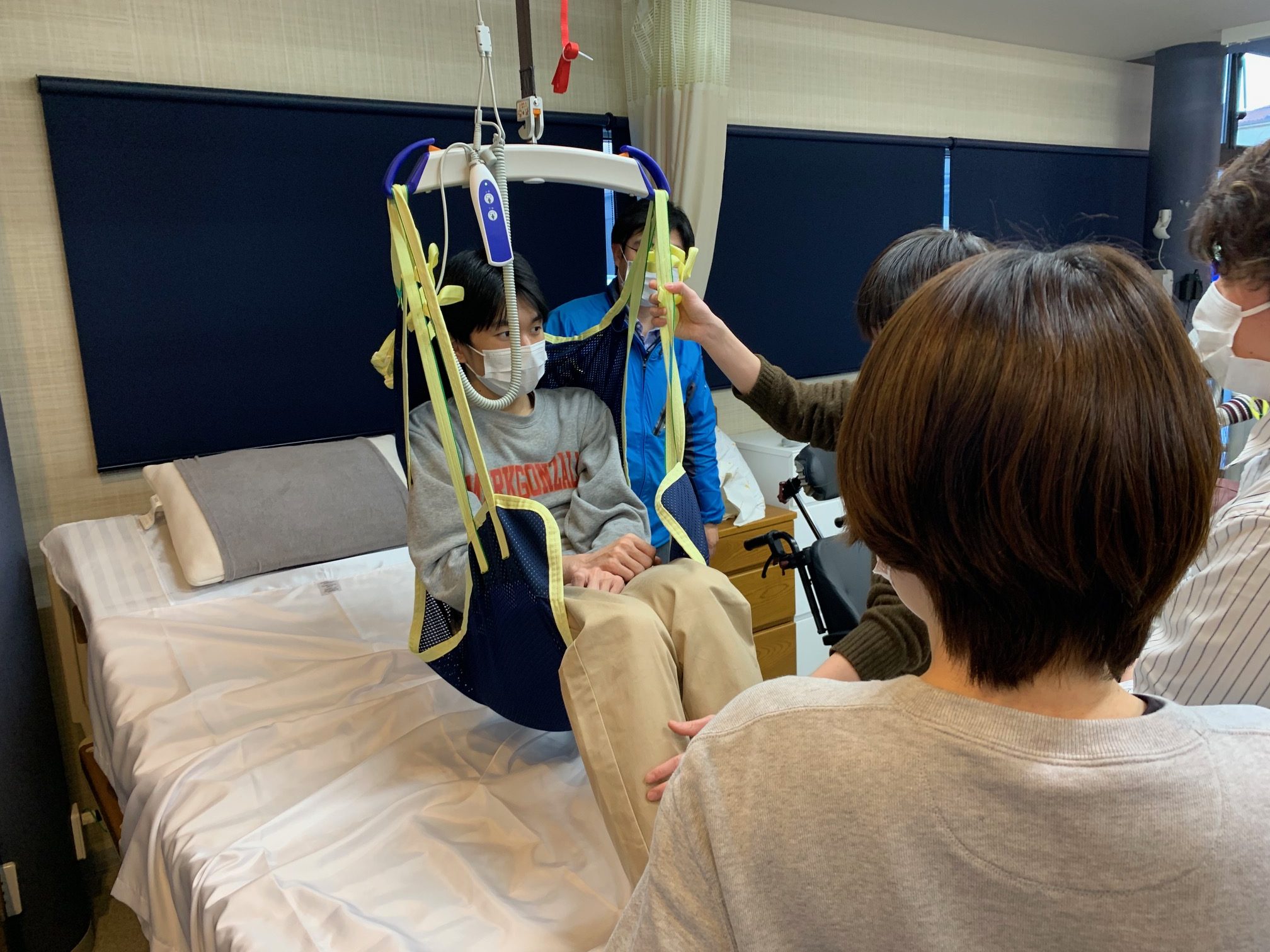 今回の講義では実際に介助する側とされる側でリフトを体験しました。