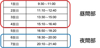 講義は1限目から7限目まであり、それぞれの時間帯は下記の通りとなります。