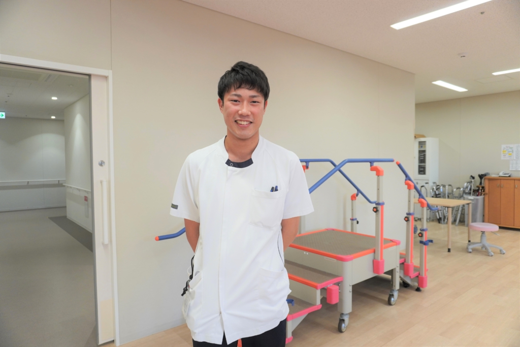 履正社の先生からの紹介です。学生時代、「総合病院でいろんな患者様と関わりたい。急性期も、リハビリテーションも、地域の高齢者の方とも、脳神経の分野も携わってみたい。トレーナー活動もやりたい」と、欲張りな夢を学科の先生に語っていたんです。そうしたら、「私の教え子で、幅広い領域で頑張れる人を探している人がいる」と、今の主任と引き合わせてくださいました。病院を見学し、お話を伺っていると、思い描いていたイメージにつながりそうな感じがあり、入職を決めました。