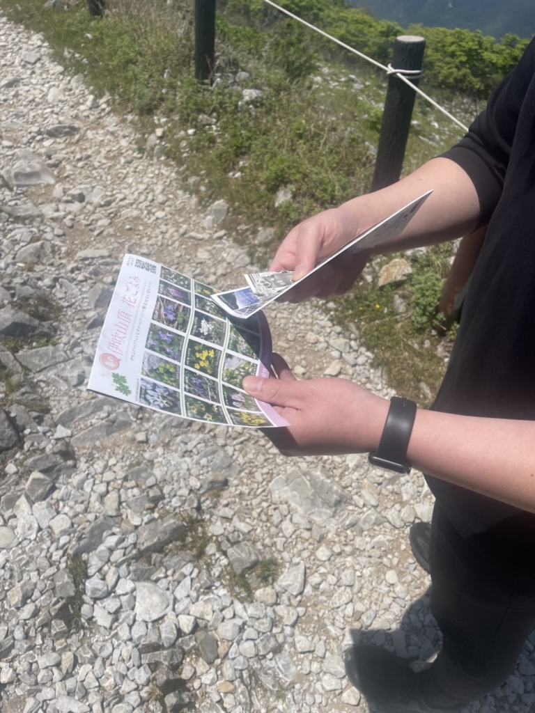 山道に咲く花の種類を確認し、「かわいいね」と言いながら、