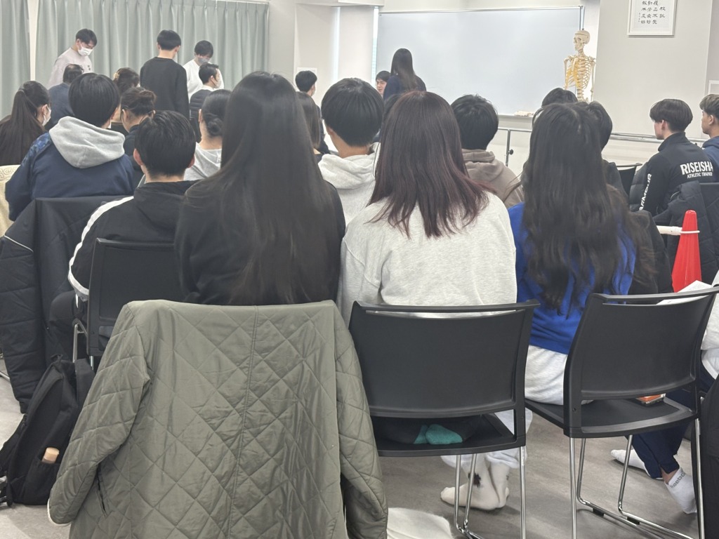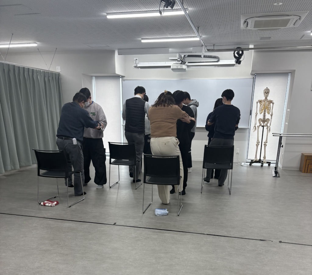 発表当日は教員がモデルとなり、対象者様4名に、それぞれの班が考えた運動のレクリエーションを指導するという内容でした!音楽の選択からメニューまで全て学生たちのオリジナルで実施しておりました。また、それぞれモデルの先生方も少し肩があがりにくいなど演技をしてもらっている状態でした。そのため、集団体操でも個別での指導も必要となる内容でした。