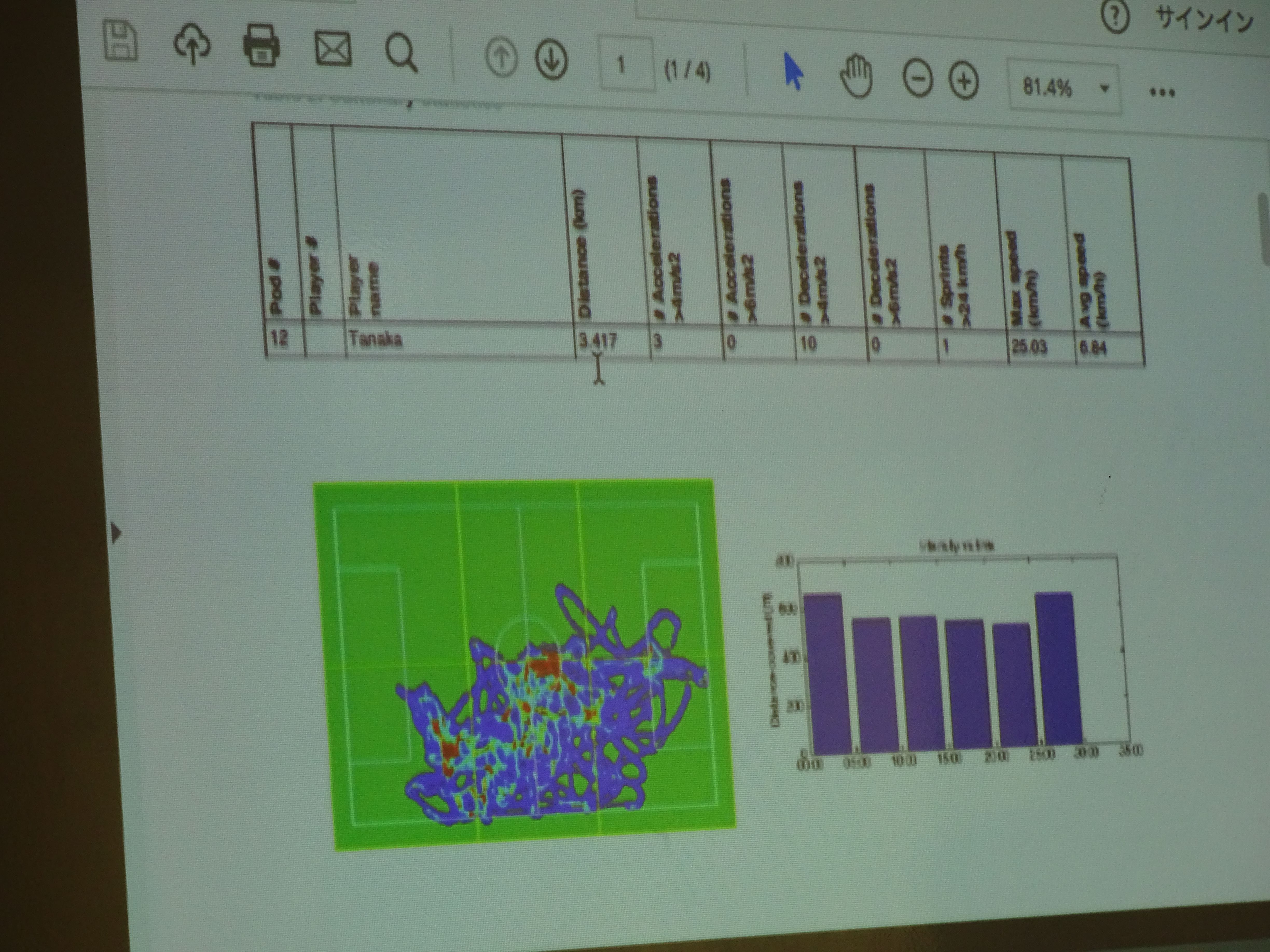 試合後には、選手個々の走行距離や、スプリント回数、平均速度、加速度、減速度を見る事ができました。