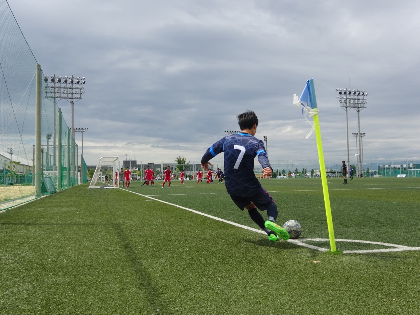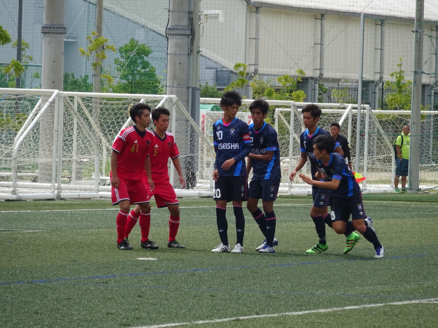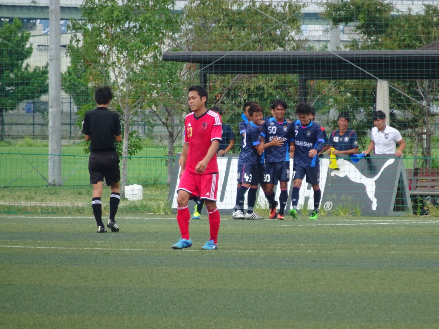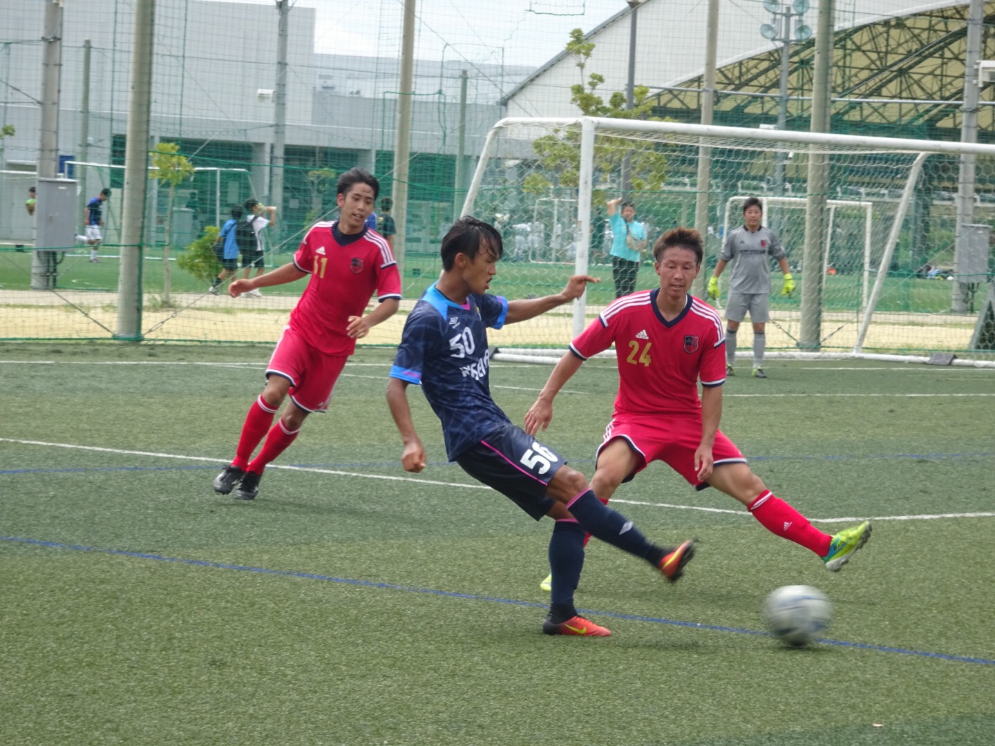 台風の影響で曇り空の下、戦いやすい気候ですが、学生チームは暑さにも負けない走力を売りにすべく、日々レーニングを行っているため若干不安でしたが、そこは関西専門学校サッカー選手権大会三連覇を成し遂げた自信溢れたプレーで試合をモノにしました。