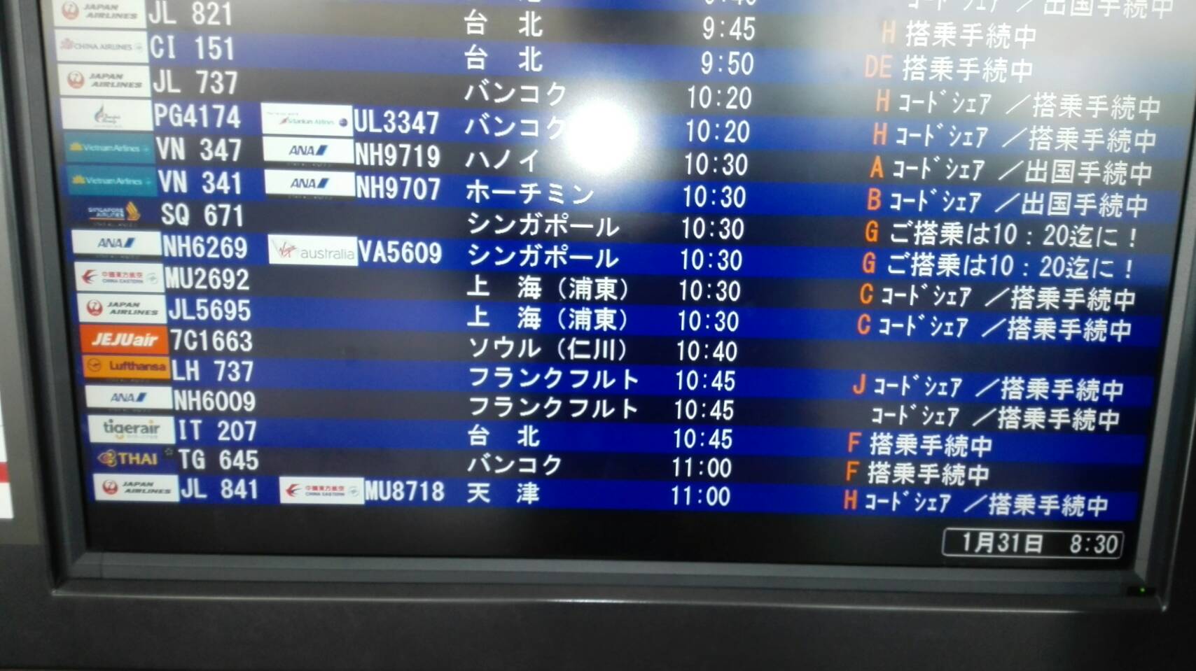 1月31日10:45に出発の飛行機に合わせ、8:30に空港に集合しました。