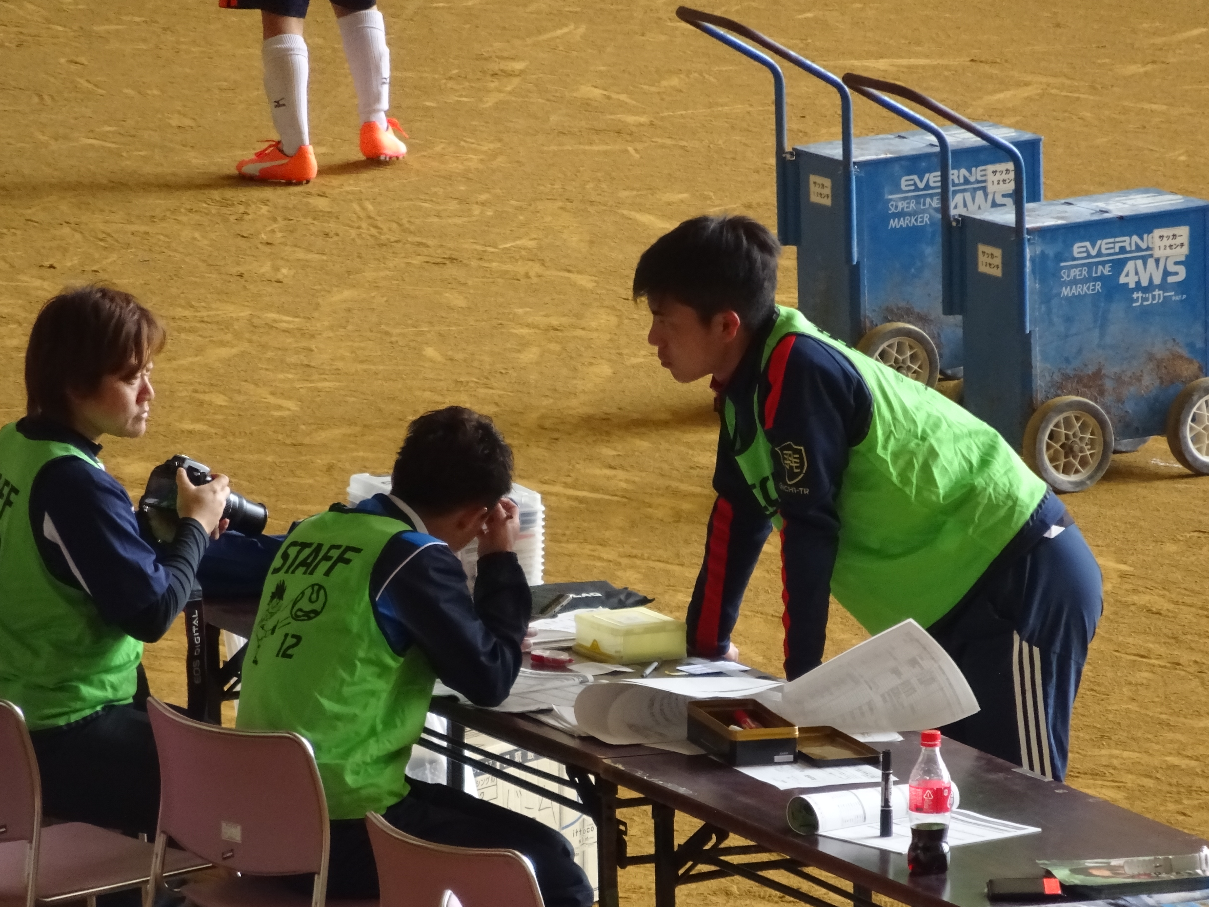 大会が始まると、初日の3日であれば渋滞で審判に割り当てられているチームが間に合わない場合は、主審を行ったり、本部担当として試合結果の集計・報告・各種案内の業務を行います。