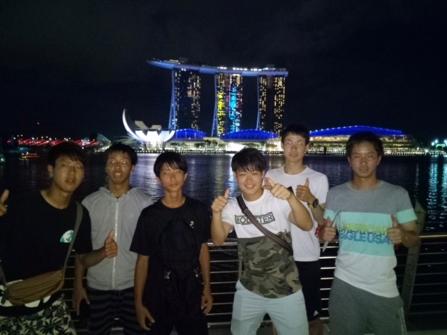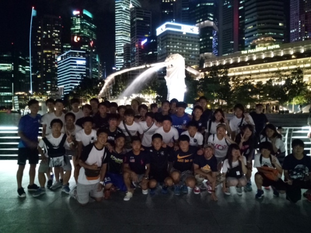 「今日からシンガポールに6日間アジア研修として2年生全員で来ました。関西空港に集合し、飛行機で香港経由でシンガポールにいきました。香港には約3時間滞在し、食事をとったり空港内を散策したりしました。シンガポールには現地時間の20時に着きバスに乗ってホテルへ向かいました。チェックインを済ませた後、全員でMRTの練習を兼ねてマーライオン公園にいきました。そこではマリーナベイサンズを見たり、マーライオンを見たりし、全員で集合写真を撮ったりしました。時差は日本と1時間だけなので、時差ボケというものはありませんでしたが、飛行機移動が長かったので疲れました。明日は午前中は観光、午後からは指導や試合があります。シンガポール代表(U-21)と試合が出来るのは凄く嬉しい事で良い経験になります。楽しみたいと思います。」