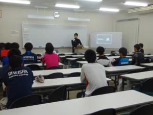 2017年3月に本校サッカーコースを卒業した田代洸人くんが就職し働いている岸和田スポーツさんが、スパイクに関するレクチャーを実施してくれました。