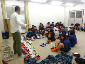 自分の足に合ったシューズの選び方や自分の足の大きさやどんな形なのかを知るための計測、そして実際に一人ひとりアドバイスを貰って試し履きもさせて頂きました。