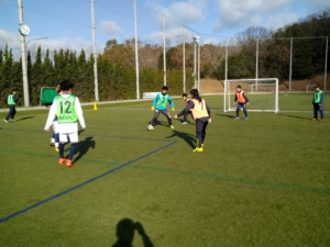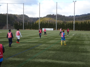 教員も交えて、1/4コートで7対7のミニゲームでウォーミングアップをし、その後にフルコートでの試合を20分×3本行いました。