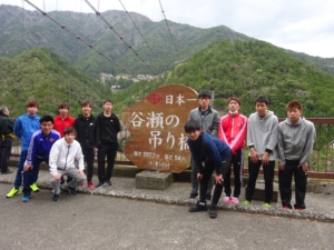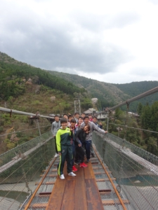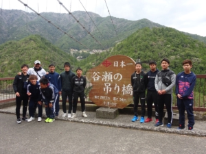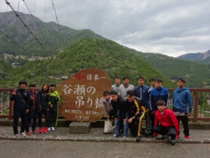 このオリエンテーションキャンプの目的は、卒業までの2年間を円滑に過ごせるようにグループワークや、社会人としての心得、様々な目標設定を皆で学ぶ貴重な研修です。先ずは、茨木キャンパスでオリエンテーションの日程や注意事項を確認し、早速バスに乗り、奈良県十津川村にある日本一の吊り橋である【谷瀬の吊り橋】へ行きました。