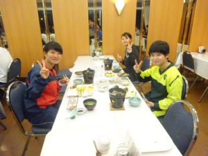 吊り橋を渡る前に見た感じよりも、実際に渡った方が怖いのです。しかし、恐怖心も無く楽々と渡ることもできる人もいます。谷瀬の吊り橋の後は、再度バスに乗り【川湯温泉みどりや】さんへチェックインし、学園生活について学び、自己紹介、9人のポジションのプログラムを実施しました。夕食はバイキング形式で楽しく食べることができました。