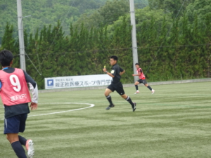 今年度、「審判法Ⅱ」を受講している1年生佐伯君が、紅白戦の主審を行い、笛を吹きます。