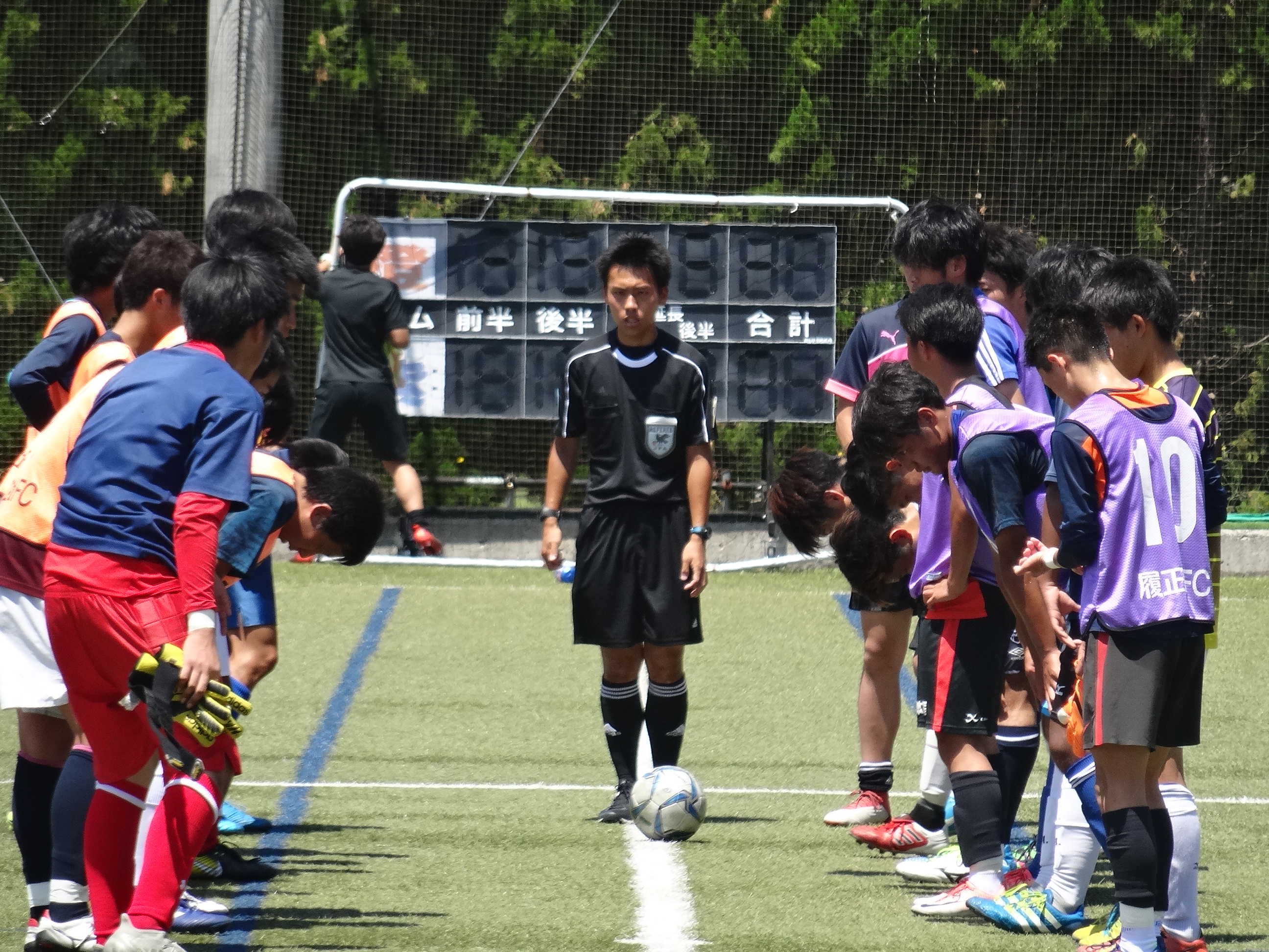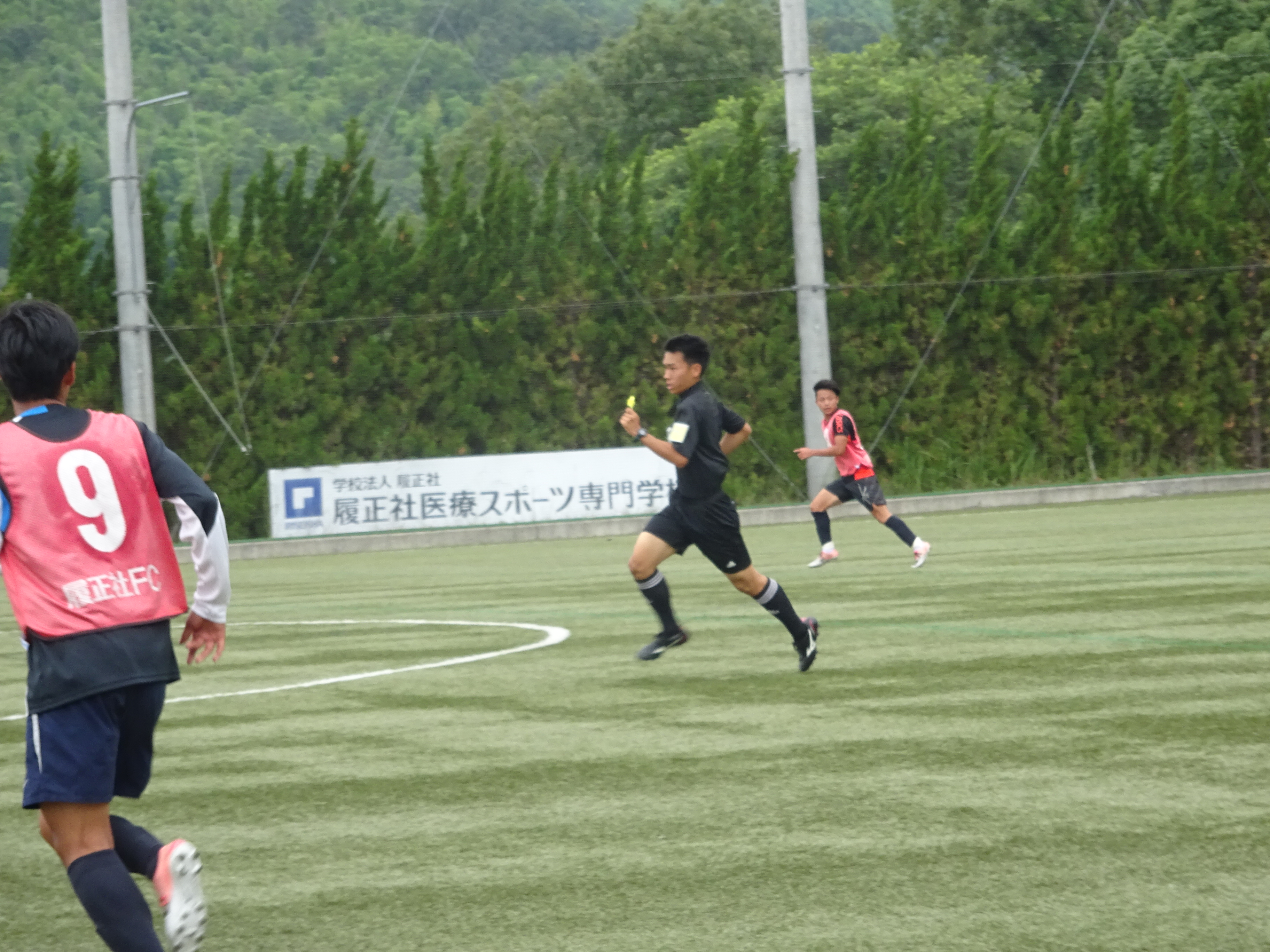 今年度、「審判法Ⅱ」を受講している1年生佐伯君が、紅白戦の主審を行い、笛を吹きます。