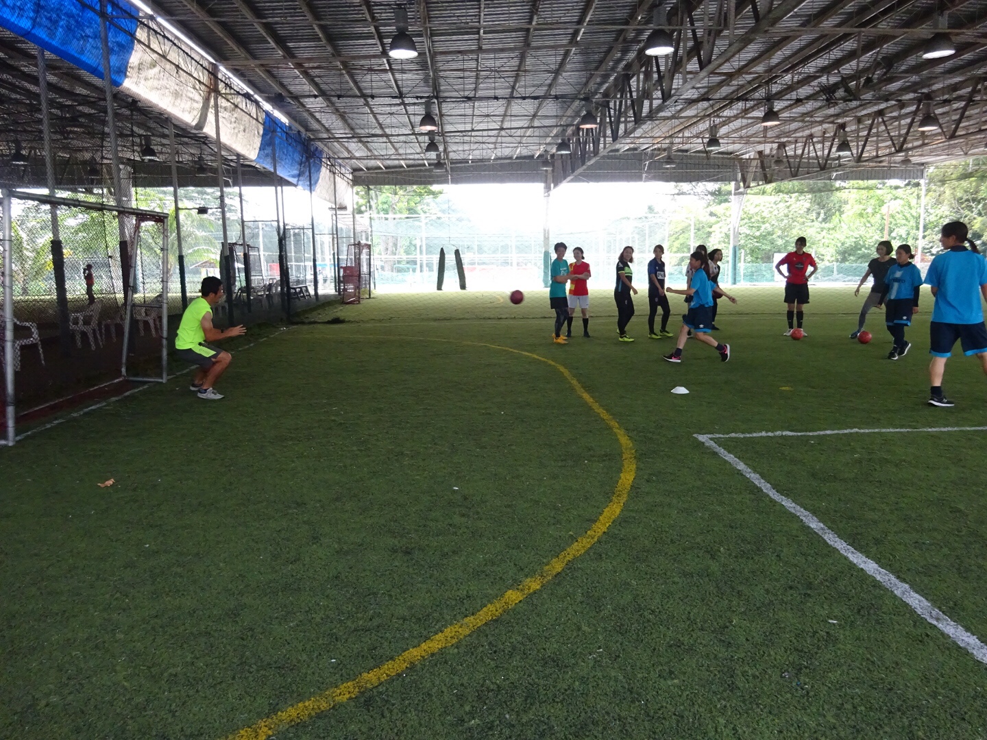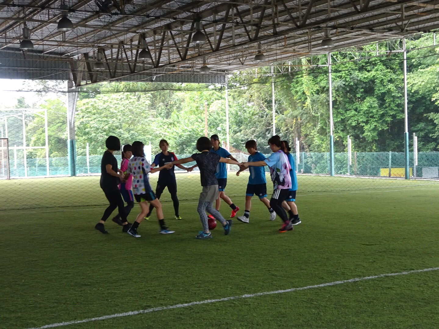 一方、女子はホテルを10:00に出発し、GFAのママさんフットサル教室に参加しました。フットサル教室では学生が参加したことにより、21名の選手と4人のスタッフ総勢25名おり、ウォーミングアップを行なった後、ゲームを長く行いました。
