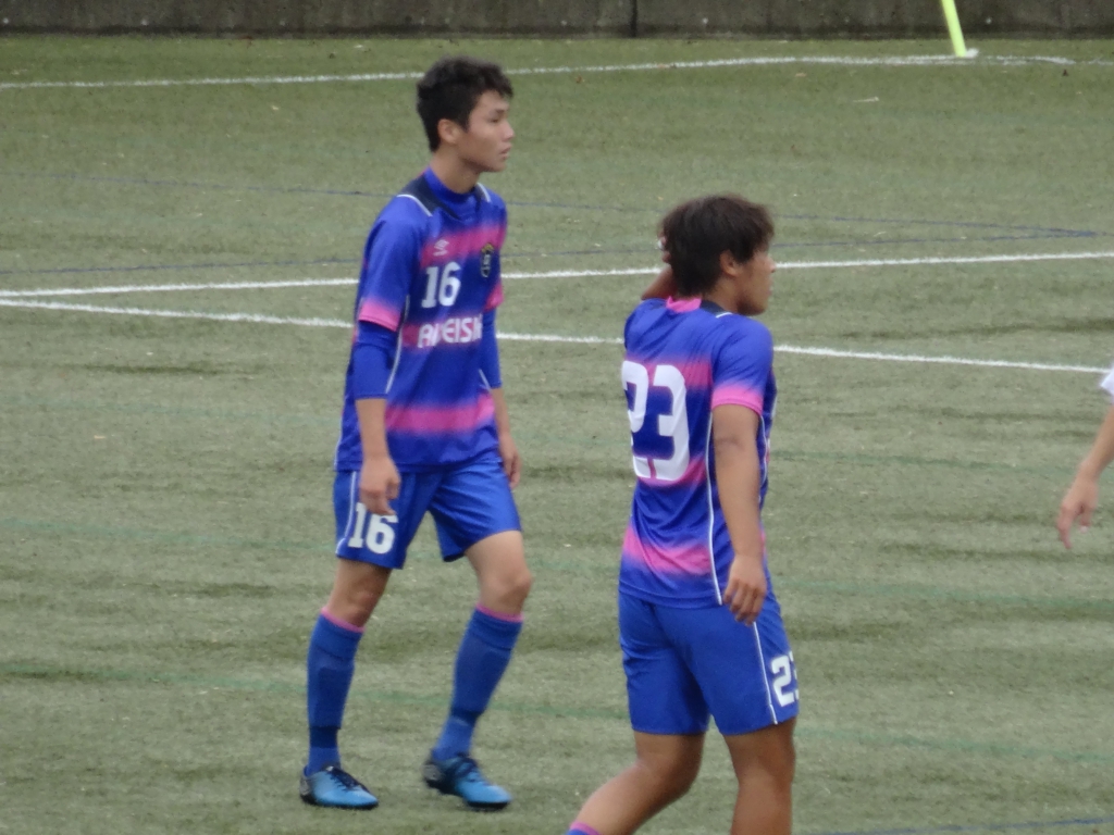 前半は、開始7分に先制することに成功しました。その後も、終始自分たちのペースで試合を運ぶことができました。追加点が欲しい中、サイド攻撃や長短のカウンターといった攻撃の理想の形でチャンスも多数作りましたが、なかなか決めれずに時間が過ぎました。やっとのことで追加点が決めれたのは、前半20分、松尾のふわりと浮かせた優しいミドルシュートは相手キーパーの左手をかすめ、ゴール吸い込まれていきました。待望の2点目が決まり、前半のうちに3点目を取りたかったのですが、前半終了の笛が鳴りました。