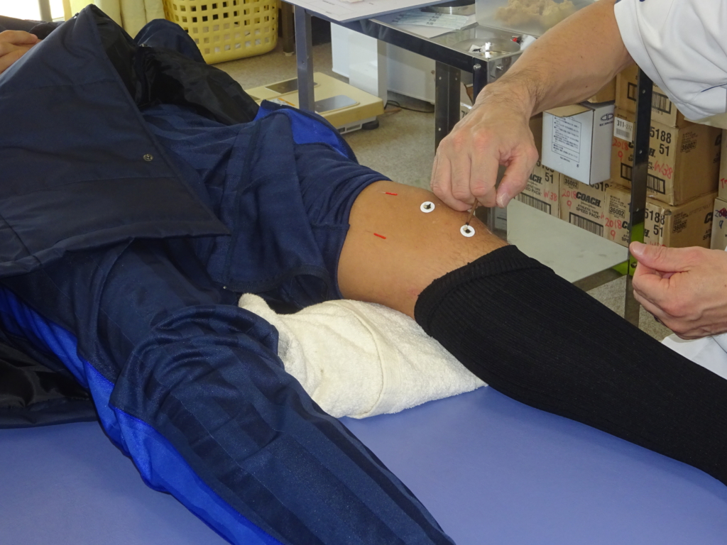 試合後や試合の合間に疲れた身体をアイシングしたりストレッチしたり・・・。また、鍼灸体験ですぐに癒せます!