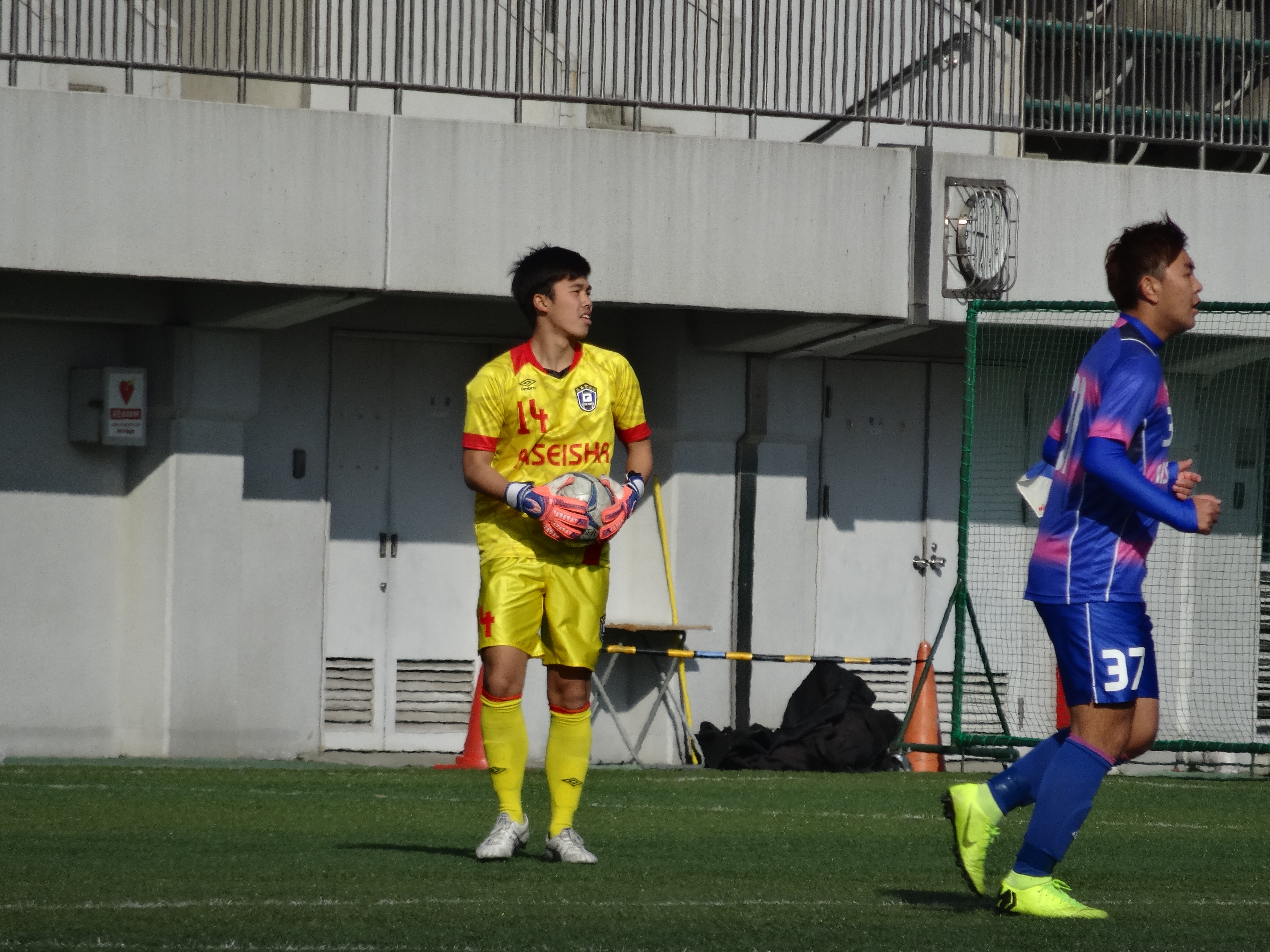 後半が始まり数分経ちましたが、相手の攻撃テンポは前半とさほど変わらず、何か余裕さを感じられました。試合の展開としては前半と同様、ボールを持たせ、ゴール前を堅くし、ボールを奪ったら、速攻でゴールを狙いました。相手は前半よりもボールをロストし、良い形で奪うことに成功。そこからカウンターを狙うことができましたが、攻撃の迫力が足りず、攻撃回数は増えましたが、ゴールにはなかなか直結しませんでした。全員守備という守備戦術が攻撃時の体力と集中力も奪い、徐々にディフェンスにも影響が出てきました。後半半ば、自陣ゴール正面での相手のドリブルに上手く対処できず、ペナルティエリア内かとも思われた位置でファールを犯し、良い位置でフリーキックを与えてしまい、直接入れられてしまいました。失点後、チームは下を向かず、鼓舞し合い、同点弾を狙いにいきました。選手間のポジションを変え、トップを2枚にし、より攻撃的に出たところ、相手は焦り、ボールを失うようになりました。そこからチャンスは増え、シュートで終わるようになりました。最大のチャンスは、攻撃に参加していた右サイドバックの1年富永(兵庫県立西宮今津高等学校出身)に2年梶原(愛媛県立今治東中等教育高等学校出身)はスルーパスを配給。反応した1年富永は相手キーパーと1対1になりましたが、止められてしまいました。そこから逆に前掛かりになっていたところを突かれ、カウンターを食らい、1度はGK柳田(金沢高等学校出身)がビッグセーブをしましたが、最後詰められ2失点目を喫しました。残り時間10分も無いところで諦めずに最後まで攻めましたが、1部所属のチームはやはり甘くなく、1点も取れず、試合終了し、敗退しました。負けはしましたが、成長をとても感じられた試合になりました。