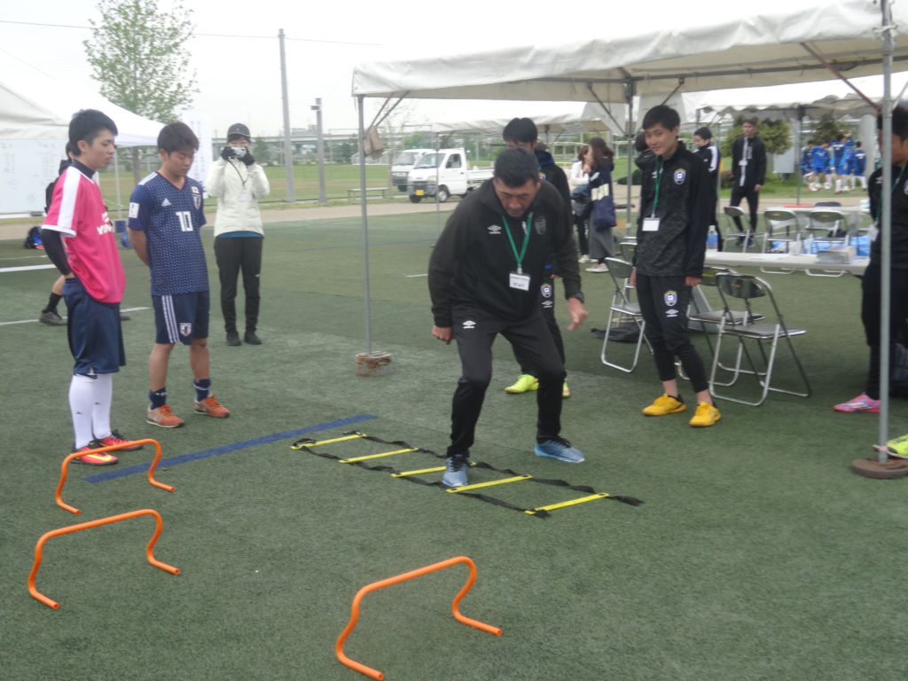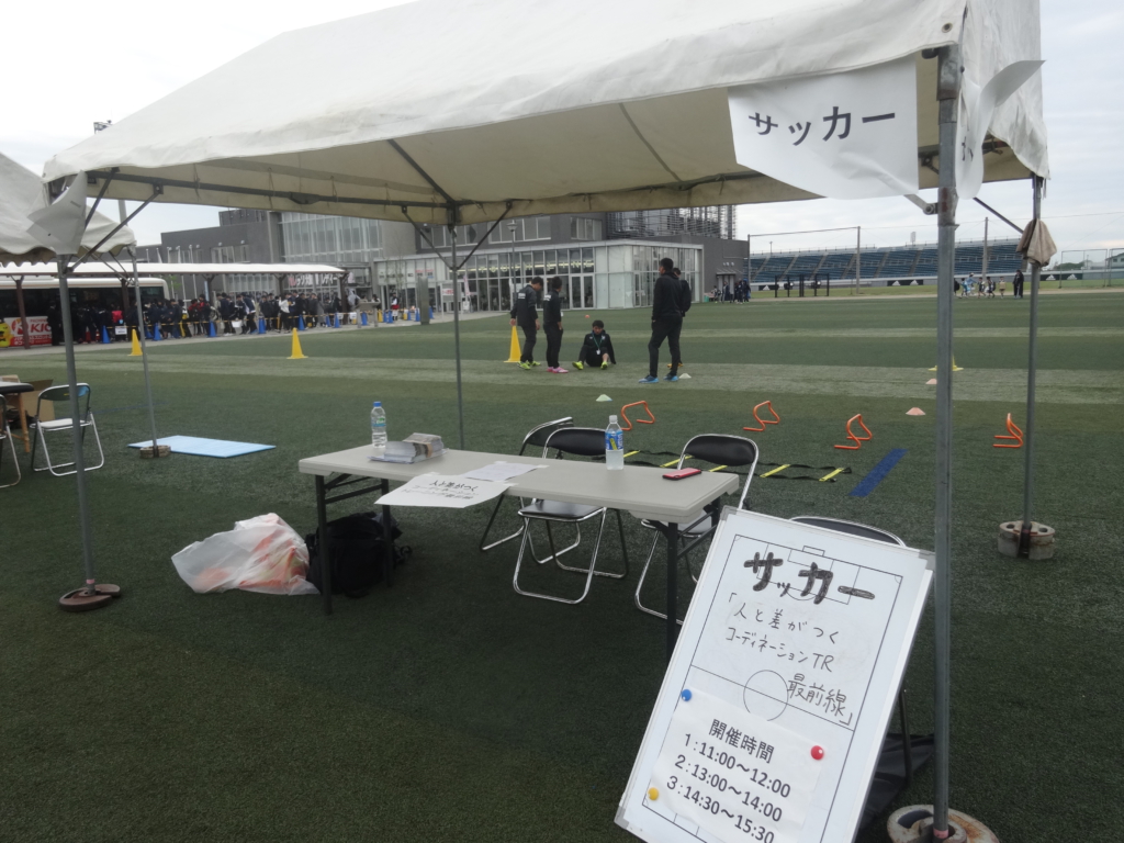 サッカーブースではサッカーコースGMの高祖先生による「コーディネーション」と「ライフキネティック」のトレーニングを体験してもらうメニューでした。