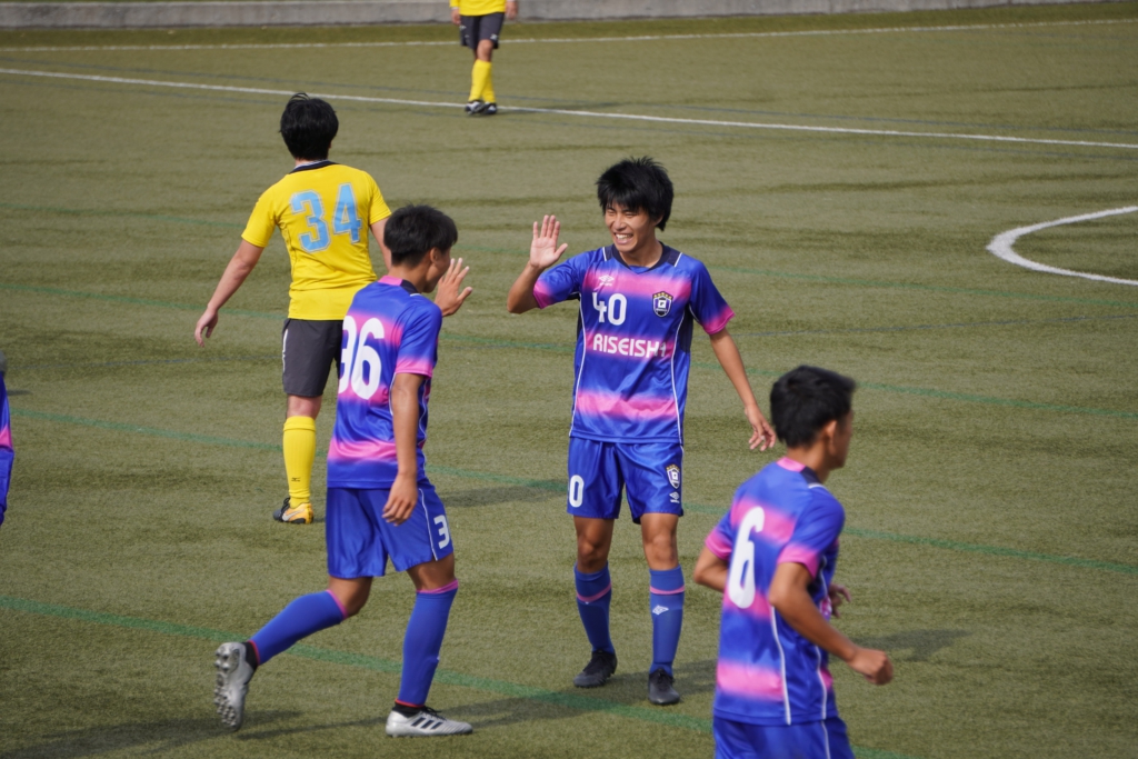 ▶逆転弾を決めた1年市原㊱(京都両洋高等学校出身)にハイタッチする2年田代㊵(JAPANサッカーカレッジ出身)