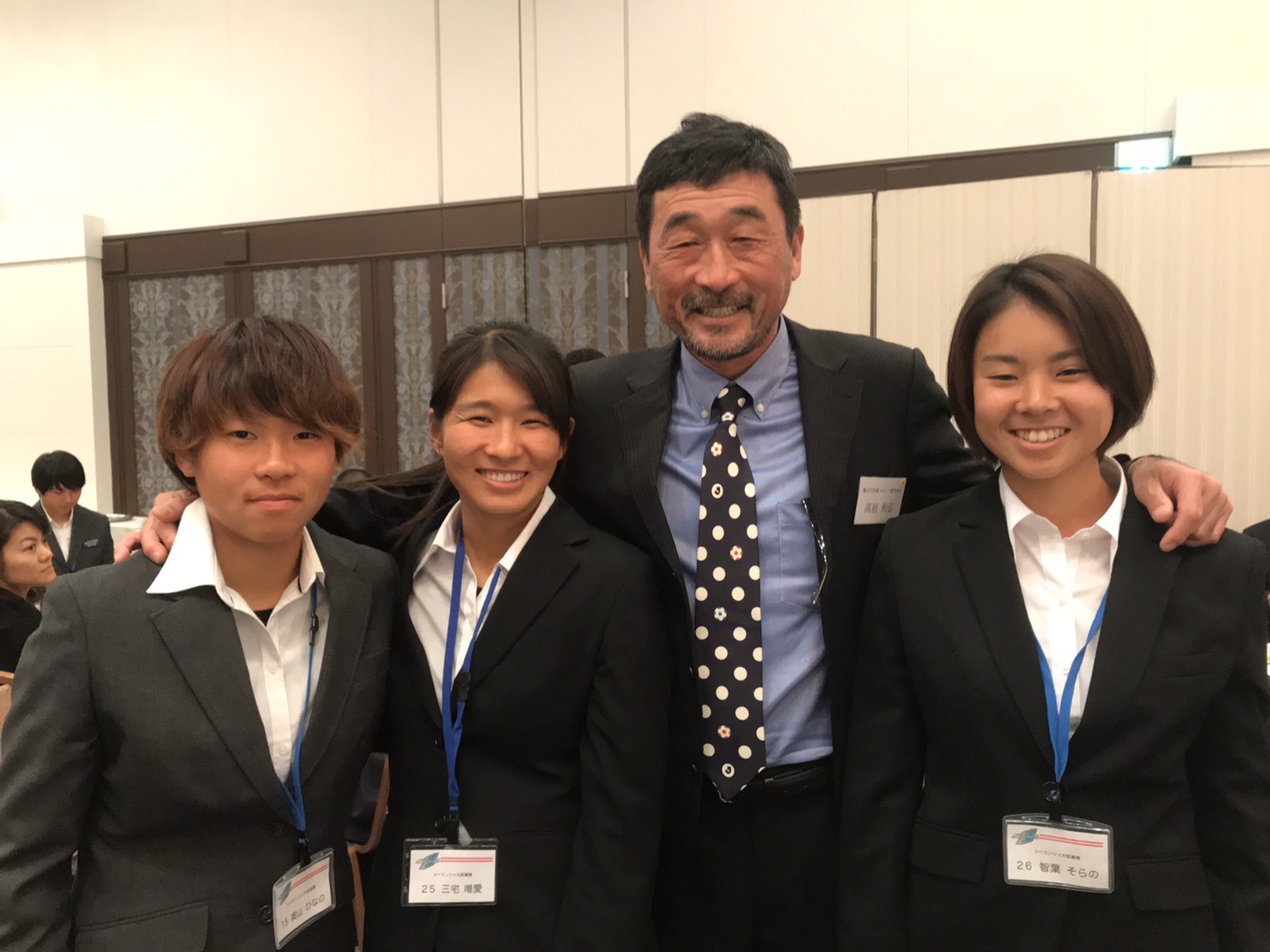 ▶記念にサッカーコースG.M.高祖先生と写真を撮りました!(右から:智葉・三宅・奥山)