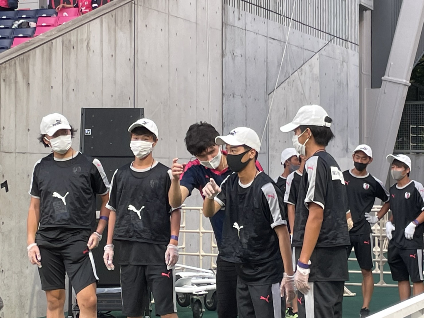 セレッソ大阪ホームゲーム運営実習では、案内所でのアテンドや手荷物検査、試合前のボールパーソンや選手入場時のローピング、そして試合時の担架隊など、様々な形で試合運営における業務を体験させて頂きます。