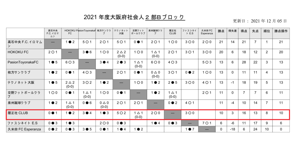 各チームの消化試合数にバラつきがありますが、履正社CLUBは3勝4敗1分の勝ち点10となり、暫定8位。