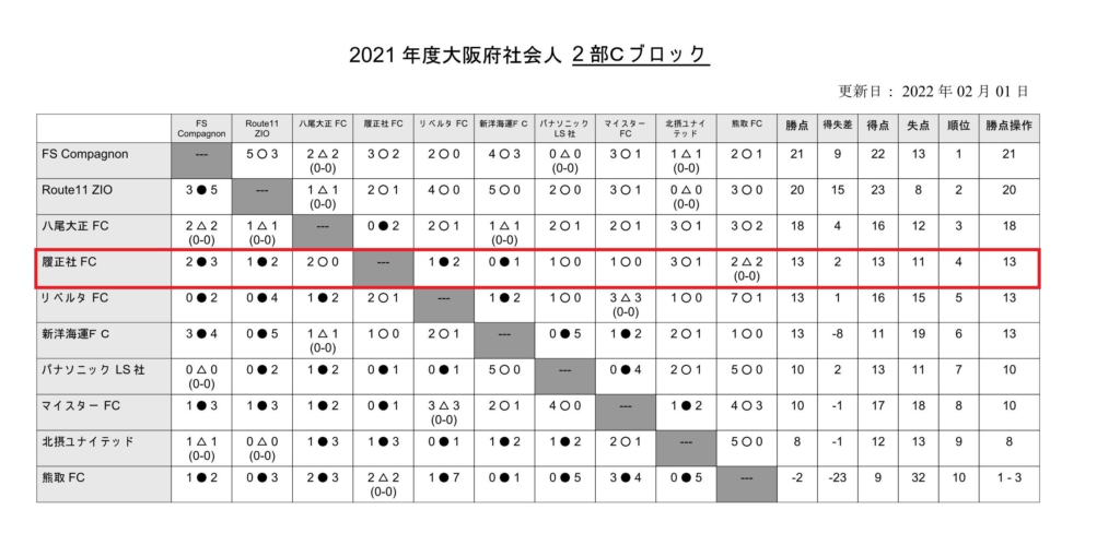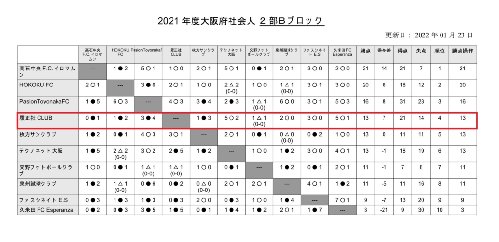 履正社FCと履正社CLUBが年間を通じてのリーグ戦に参加している「大阪府社会人サッカーリーグ」での2021年度最終成績が確定しました。