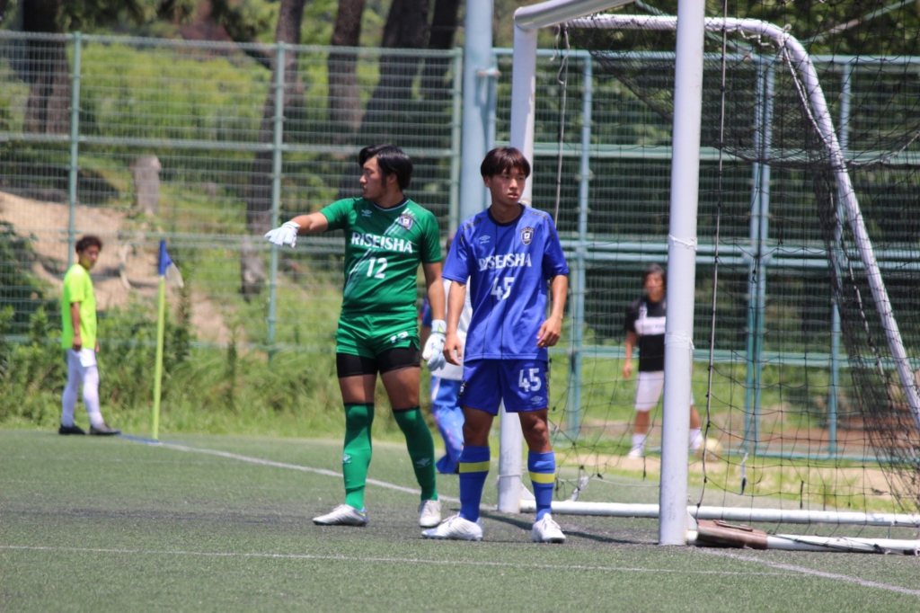 ▶コーナーキックを守る2年生GK:藤田 壮馬(京都両洋高等学校 出身)と1年生:堤 崇太(日本教育学院高等学校 出身)