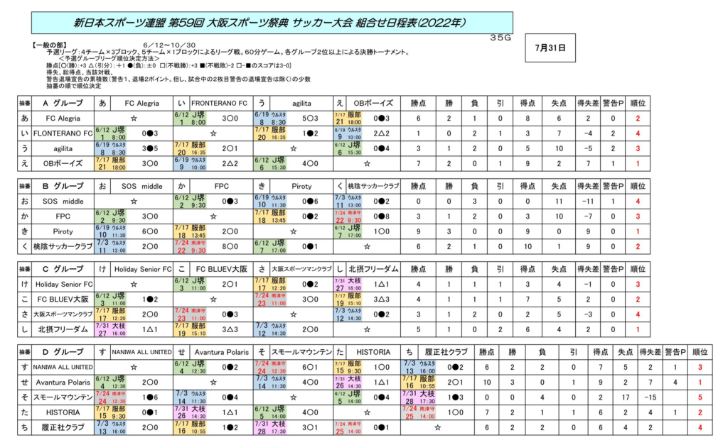 昨年度の大会では準優勝を果たした「大阪スポーツ祭典サッカー大会」の予選リーグ第4節(予選リーグ最終節)が7月31日(日)に大枝公園多目的球技場でありました。