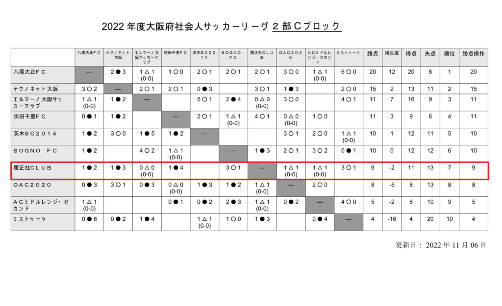 大阪社会人サッカーリーグ2部Cブロック第9節(最終節)