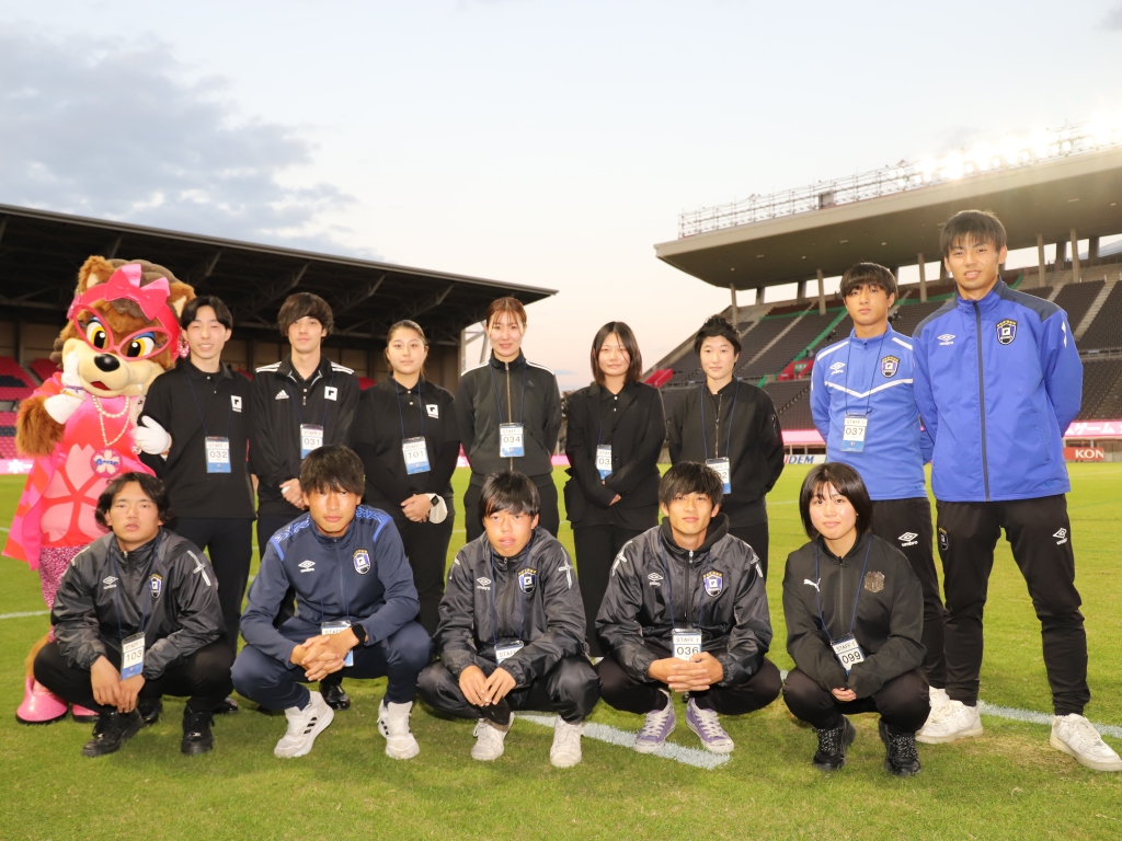 ▶最終戦の実習に参加したサッカーコース&スポーツ外国語学科の学生とチームキャラクターのマダム・ロビーナ(後列左端)📷
