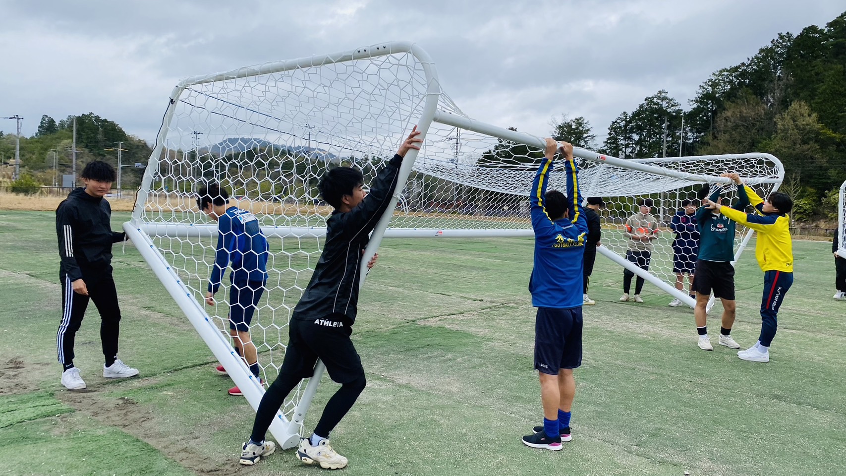 の前に、初対面同士のみんなでコミュニケーションをとり協力し合いながら、これから使用するゴールにネットを張りました!これもグループワークです。