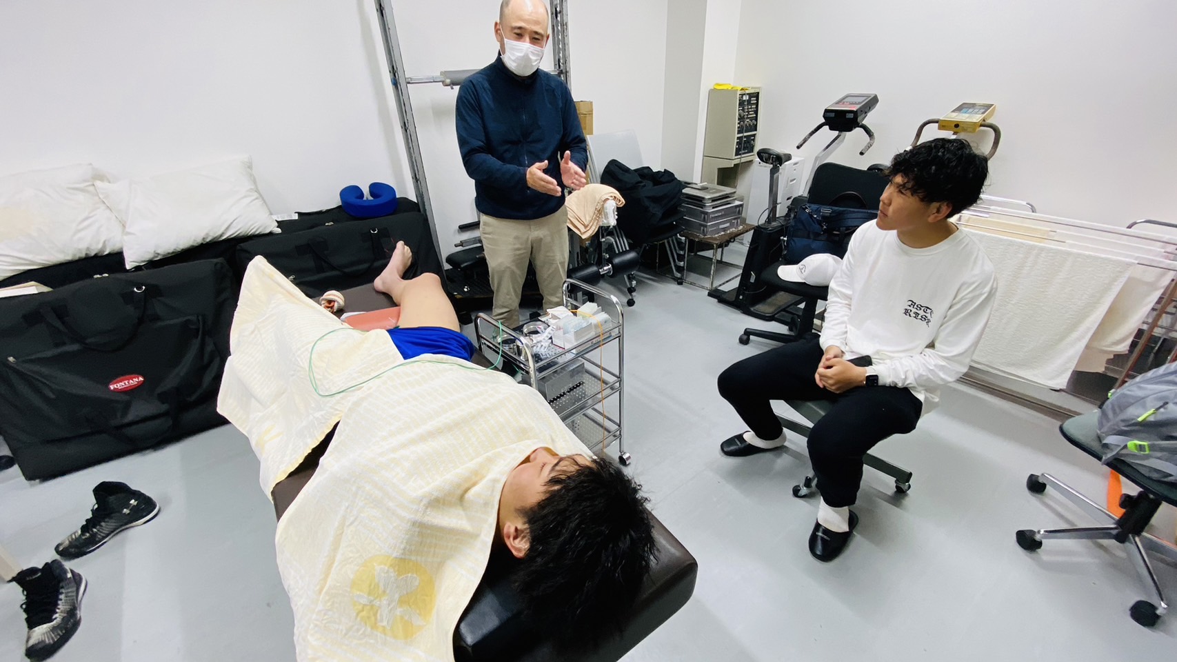 練習中に痛めた足や疲労が溜まった足をマッサージや鍼灸で治療してくれています。