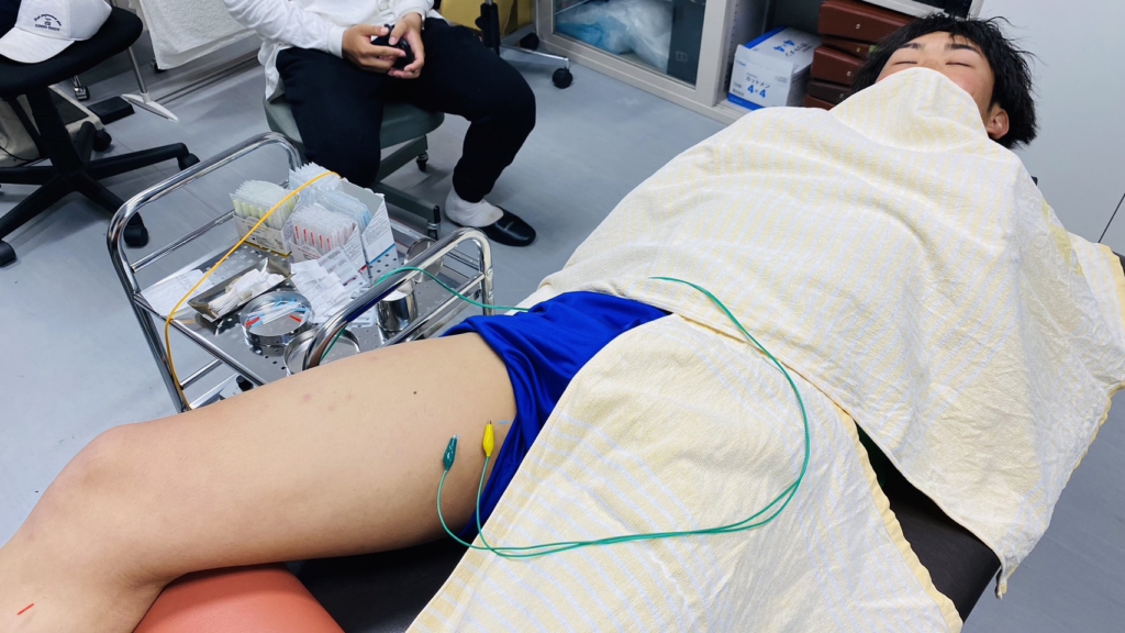 ▶鍼を通して電気を患部に当て、学生も気持ち良さそう