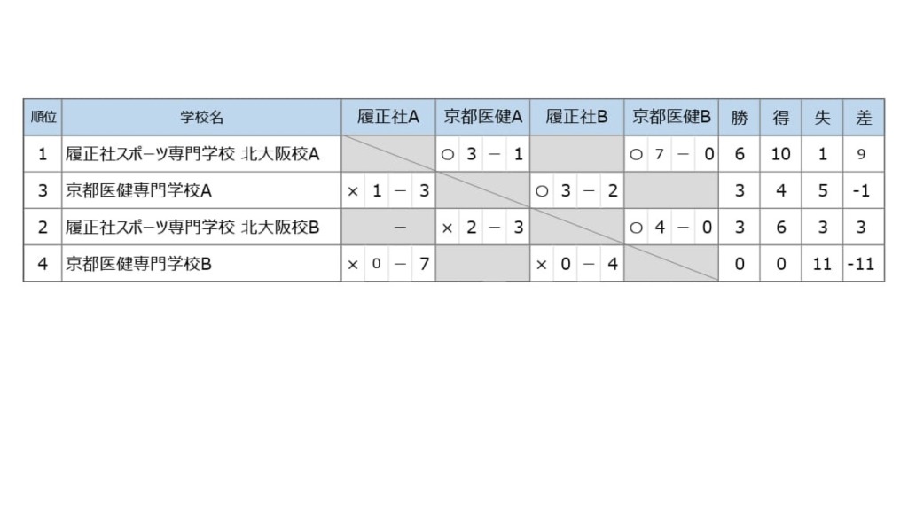 今年度は履正社スポーツ専門学校北大阪校から2チーム、京都医健専門学校から2チームの計4チームで、自チームとは対戦しない変則的な総当たり戦を行いました。主審は本校レフェリー専攻の村瀬颯汰(1年:高知中央高校)が務めました。