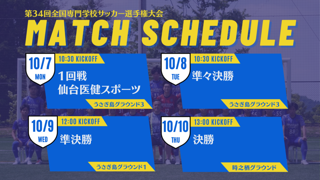 10月7日~10日まで時之栖グラウンド(静岡県)にて、第34回全国専門学校大会サッカー選手権大会が行われます。