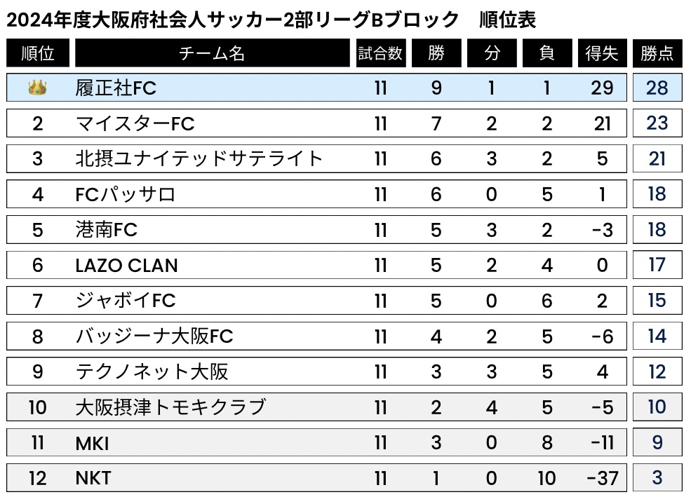 履正社FCは12月1日に開催された「大阪府社会人サッカー2部リーグBブロック 最終節」をもちまして、リーグ戦全11試合が終了しました。