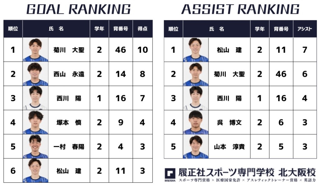 2年菊川(滋賀学園高校)が二桁得点となる10得点を決め、得点王に輝きました。さらにアシストランキングでも2位となる6アシストを決め、総得点40のうち16点に関与しました!1年西川(第一学院高校)が1年生で唯一のランクイン。シーズン通して試合に出場し、チームの攻撃を牽引。来年の活躍にも期待です!
