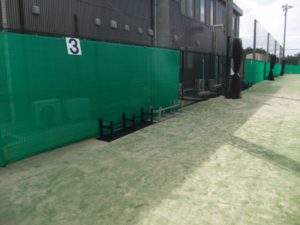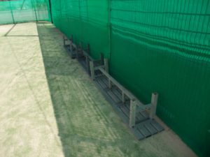 ベンチは以前の台風の時にコート内に倒しておきましたがいくつか風で飛ばされて破損してしまった物もあったので、風の影響の少ない建物の近くのフェンス脇に変更。