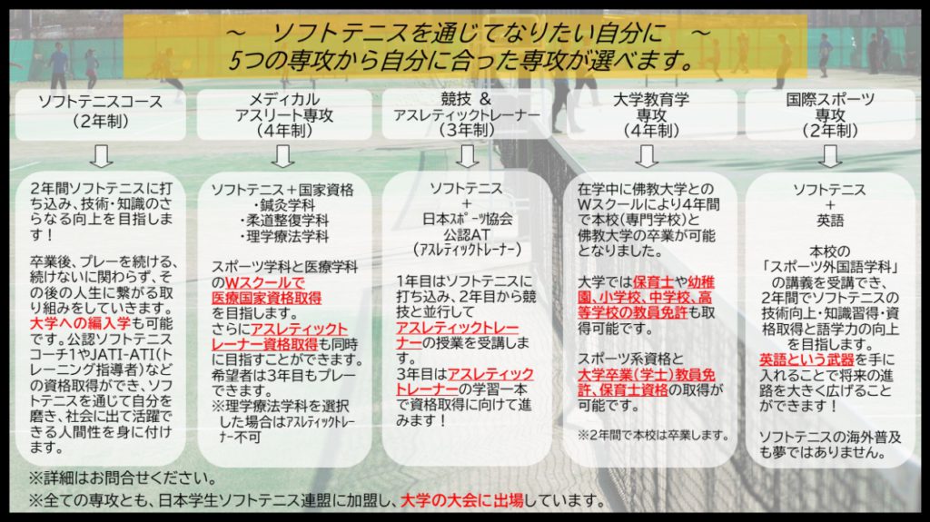ソフトテニスコースでは将来の夢に向かって大きく分けて5つの専攻から自分に合った専攻を選ぶことができます。