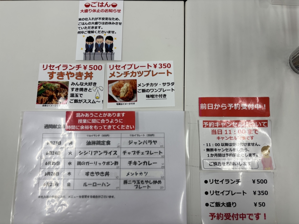 2025.06.26 食堂での様子 本日の食堂メニュー 350円 メンチカツプレート 500円 すきやき丼 いつもおいしい食堂のご飯を食べて 午後からの授業も頑張っていこう! 前の記事 記事一覧 次の記事